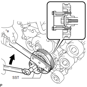 (a) Using SST, install the crankshaft pulley with the pulley set bolt.
