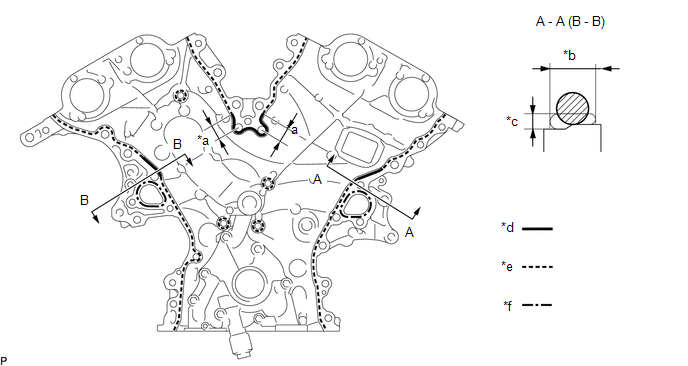 (e) Apply seal packing to the timing chain cover assembly in a continuous line as shown in the following illustration.