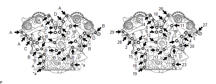 (g) Install the timing chain cover assembly with the 27 bolts, labeled A, B, C and D, and the 2 nuts. Tighten the bolts and nuts in the order shown in the illustration.