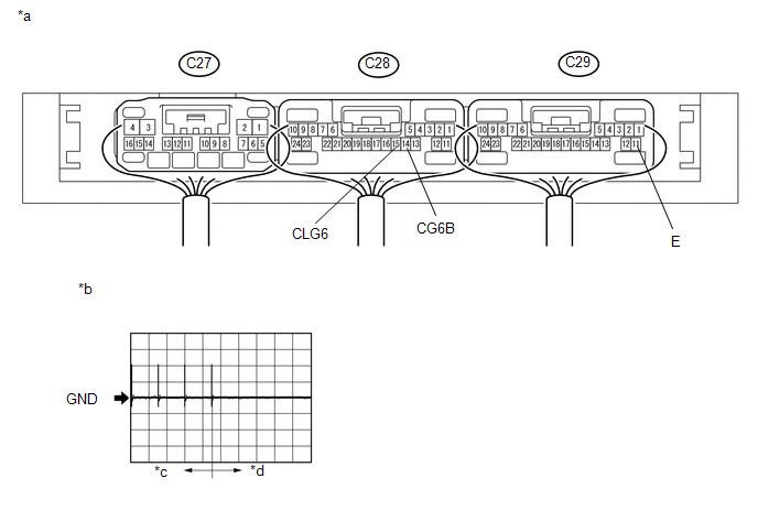 The certification ECU (smart key ECU assembly) generates a request signal and transmits the signal to the No. 2 indoor electrical key antenna assembly (rear floor). For the No. 2 indoor electrical key antenna assembly (rear floor) to detect when the electrical key transmitter sub-assembly is inside the vehicle, the signal from the certification ECU (smart key ECU assembly) requesting a response from the electrical key transmitter sub-assembly is transmitted inside the vehicle. DTC B27A6 is stored by the certification ECU (smart key ECU assembly) when an open circuit is detected between the certification ECU (smart key ECU assembly) and No. 2 indoor electrical key antenna assembly (rear floor) (between terminals CLG6 and CLG, or terminals CG6B and CLGB).